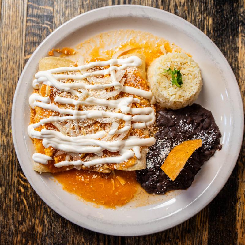 filled with shredded chicken breast or Chihuahua cheese - choice of salsa, onion, crema, queso cotija, rice, refried beans - Salsas: Roja, Verde, Mole Poblano